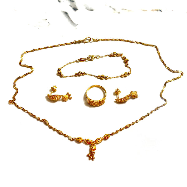 Experience timeless elegance with our 4-Piece Wedding Set crafted from premium 22 carat gold. This exquisite set features a beautifully designed necklace, bracelet, and earrings, all finished with a clean polished surface that enhances its radiant shine. Each piece reflects exceptional craftsmanship, perfect for celebrating your special moments with sophistication and style.