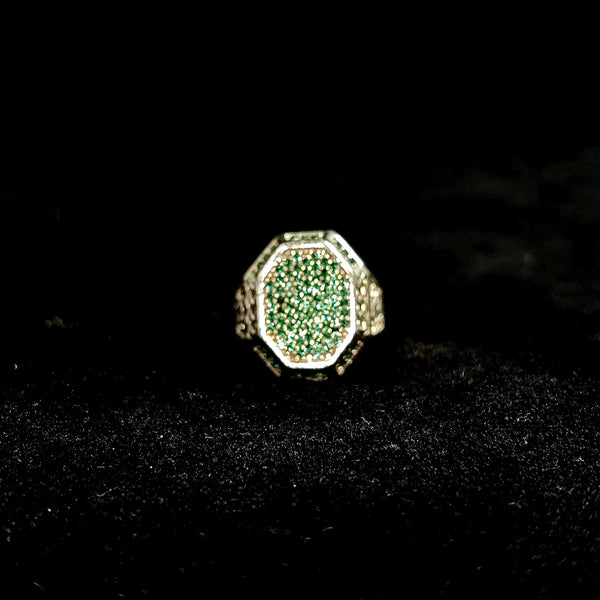 Make a bold statement with the Emerald Dynasty Ring — crafted from high-quality 925 Sterling Silver and finished with a luxurious gold plating. This ring features a clean polished finish and a striking octagon-shaped top encrusted with brilliant green CZ stones that exude elegance and power. Designed for those who appreciate fine detail and eye-catching sparkle, this piece perfectly blends classic prestige with a modern edge.