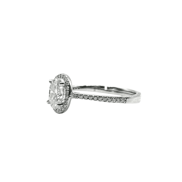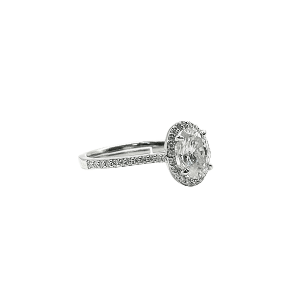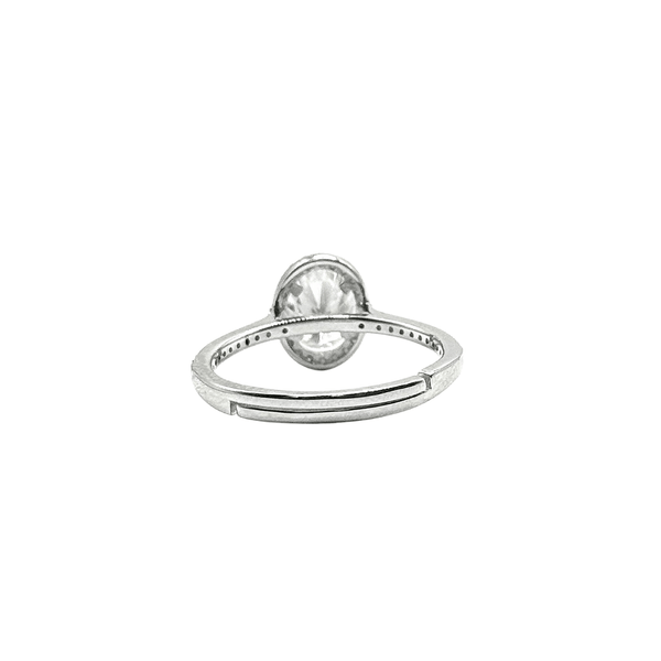 The VVS Moissanite Oval Solitaire Ring with Pavé Halo features an elegant oval-cut center stone surrounded by small moissanite stones that enhance its brilliance and visual size. A refined yet powerful luxury design.